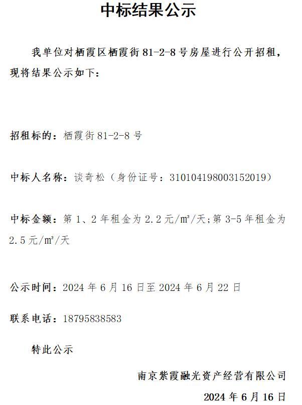 栖霞区栖霞街81-2-8号房屋公开招租结果公示