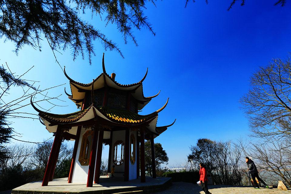 碧云亭位于虎山之巅,又名“望江亭”,登临仰天而望,但见碧云万里,俯视平野,不尽长江滚滚来。这条貌似半岛的平顶岗峦,向北伸出,三面均是悬岩,仅一石与山道相连,构成别具一格,是以险取胜的景点。其东侧深谷陡壁,岩石裸露,峻峭无比,西侧,由松涛林海铺成的起伏岗峦,蛰伏于脚下,不时随风传来呼啸而起的林涛吼声,恰似“沙场秋点兵”最气派的景色是向北眺望,大江尽收眼底,洪涛涌过足下,两岸沃野千里,旷阔无限。这里虽不如武汉黄鹤楼的闻名遐迩,但其胜景却不减黄鹤楼气派,黄鹤楼有张之洞题写一联道的好:“爽气西来,云雾扫开天地恨,大江东去,波涛洗尽古今愁,”看来用于“碧江亭”上也很贴切。