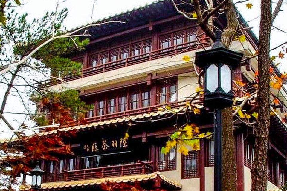 唐代茶圣陆羽(公元737—804年)字鸿渐,湖北天门人,唐代棕大历年间(766-779年)品遍各地名泉名茶的陆羽专程至栖霞山种茶,采茶、炒茶、品茶,最终著成《茶经》而被载入史册。史志载,陆羽在栖霞山种茶的范围在现今中峰和龙山之间的坡谷地,即如今的白乳泉、青锋剑、试茶亭一带,其住处称陆羽精舍,栖霞山管理处后在其遗址附近复建了“陆羽茶庄”。整个建筑为四层仿唐风格,建筑面积800平方米。登顶了望长江、紫金山、南京城,栖霞山的美景一览无余,为栖霞山风景名胜区又一名胜地。