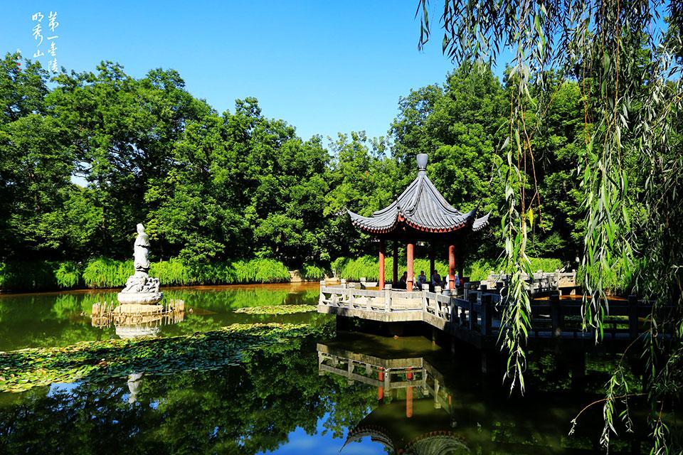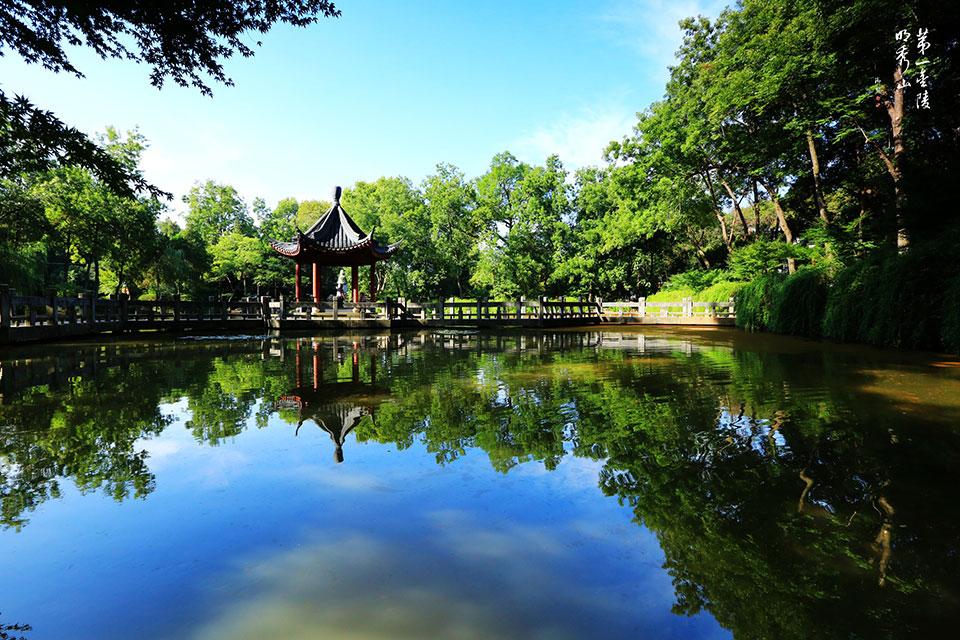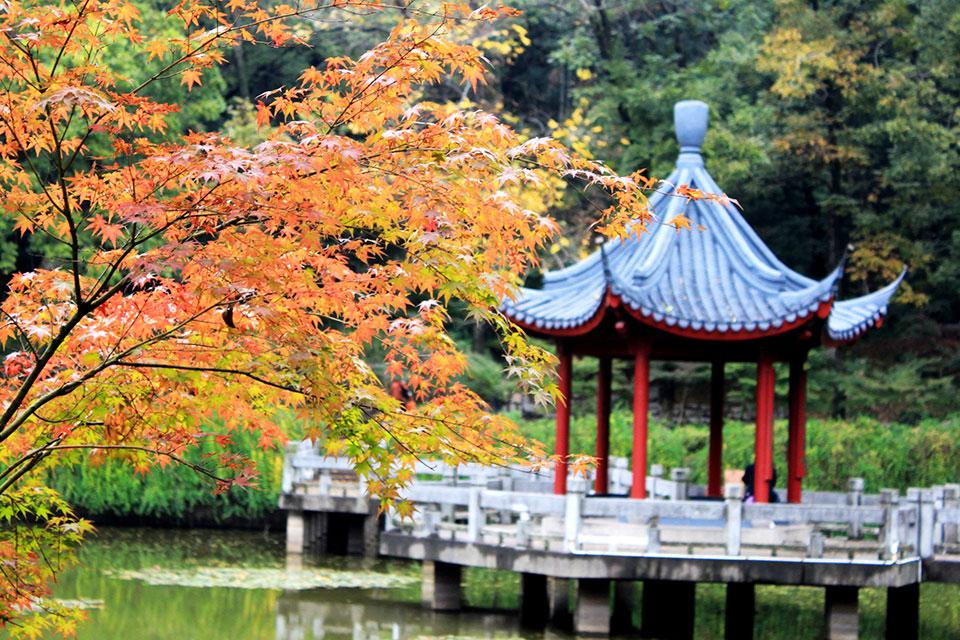 景点特色:彩虹般的曲桥贯通其中,湖水澄澈,恰是明镜;涟漪乍起,波光浮动。四周红叶倒映于内,美不胜收。