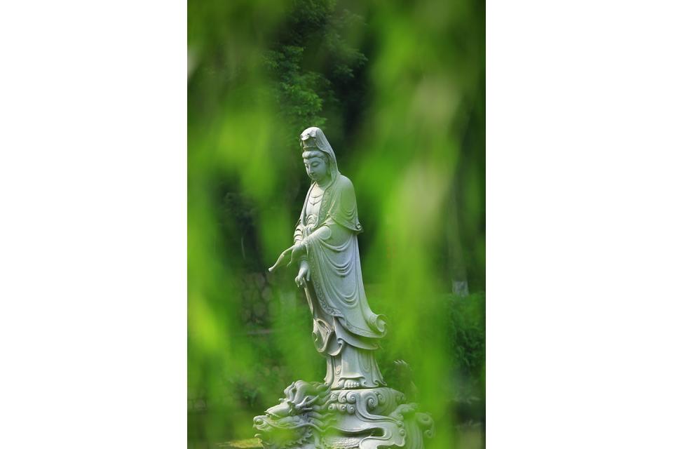 各位游客,您眼前所看到的是乾隆爷御赐栖霞十景之一的“彩虹明镜”。 “彩虹明镜”四字由著名书法家尉天池题写。碑阴刻有《复建明镜湖碑记》,记述了明镜湖水枯桥断的时间、原因和复建经过。 根据《摄山志》记载,“山上有流泉散漫无归,清乾隆二十二年(即1757年)始凿为池。水从桃花涧与中峰涧流下直喷池内,波光粼粼,清澈见底,其间怪石林立,错落崎嵌,中筑壩桥,扶栏以渡。更依山结屋,就水为亭,仿佛明圣湖边风景。”乾隆二十七年(1762年),乾隆爷再次临幸此地,赐名“彩虹明镜”。 湖中的彩虹桥于清朝咸丰年间毁于太平军与清军战火。20世纪20年代,栖霞寺住持若舜重建彩虹桥,恢复了它的原貌。在此之后,桥和亭子又经多次修葺。80年代初,明镜湖突然塌陷,桥和亭子也跟着一起消失。后来一直到1992年才复建,“彩虹明镜”得以重见天日。 明镜湖中竖立的是高达数米的石刻观音菩萨雕像,面对天下众生慈颜微笑。其后九曲石桥形似彩虹,中有六角小亭,丹楹黑瓦,翘角飞檐,上书“彩虹亭”三个大字,是当代高僧茗山法师在1991年题写。亭柱上有这样一副楹联:“满天星斗落明镜,十地圣贤来摄山”,由遵义田光烈撰书。今天的明镜湖,湖水澄碧,清澈见底,恰似明镜;彩虹曲桥,贯通其间;涟漪乍起,波光浮动;湖光山色倒映水中,美不胜收,景色比岸上还更胜三分。 我们顺着栖霞古寺的中轴线向前走,前面就是寺庙前的钟鼓楼。