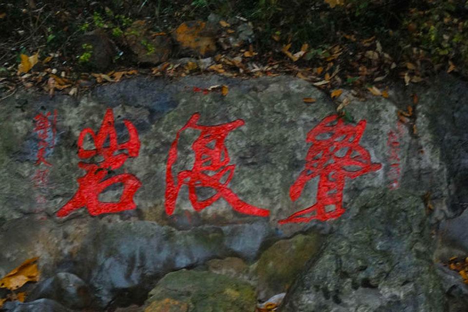 叠浪岩位于桃花涧中。以前,涧水伏有嵯峨怪石,尖削如刀,下泄之水受阻,攸然激起波澜,如大海潮汐,波澜万叠,蔚然成观。后因地址结构变化,涧水日渐干涸,露出岩石,乱石错落,其色苍黑,高低起伏,行程“伏石万叠,状态若泊澜”的沧浪景象。
