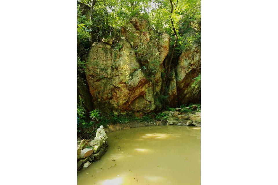 各位游客,现在您来到的是栖霞山三大名泉之一——品外泉。据史载,唐朝“茶圣”陆羽嗜茶,乐于品评天下佳泉,为他们排名,唯独这口泉,口味甚佳,却不为陆羽所知。后世文人墨客认为陆羽沧海遗珠,于是把他命名为“品外泉”。明朝文士张怡归隐休憩在栖霞山近50年,跟据他的《品外泉铭》描述,品外泉最初源自中峰涧,涧水流至千佛崖附近时,改由地下暗槽流到无量寿佛前,汇聚成池。泉水绕过舍利塔前,从暗槽流入禅房,供僧人们使用。此处岩石嶙峋,峭壁陡立,地势险要,仰视天空还有“一线天”的情趣,众多树木从岩石夹缝中长出,遒劲有力,自成一景,旁边陡峭耸立的岩壁上“栖霞秋色”四个金黄色的大字是由星云大师手书。