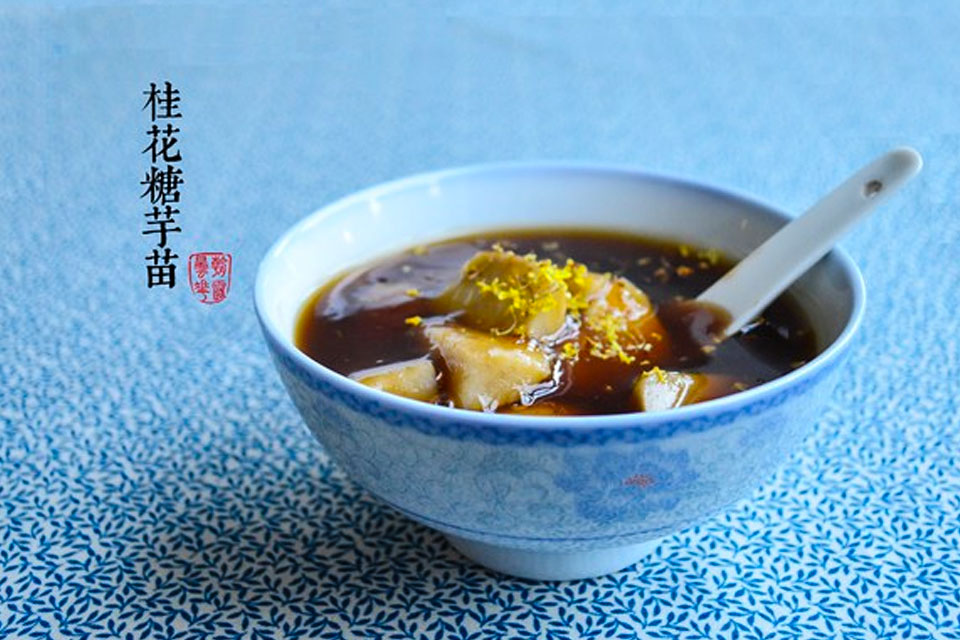 桂花糖芋苗是南京一道出名的甜点,和“桂花蜜汁藕、梅花糕、赤豆元宵”一同被誉为金陵南京四大最有人情味街头小食。选用新鲜芋苗,蒸熟后剥皮;加上特制的桂花糖浆,放在大锅里慢慢熬制。芋苗快烂时再加入藕粉,使芋苗更浓稠,芋苗煮出红彤彤、诱人的颜色。口感香甜爽口,吃后唇齿留香。