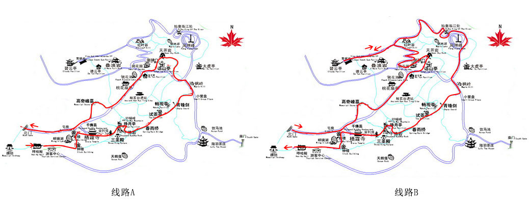 山林讲解线路B:景区入口处、彩虹明镜、桃花扇亭、桃花湖、虎山碧云亭、读枫阁、始皇临江处、太虚亭、话山亭(终点返回)